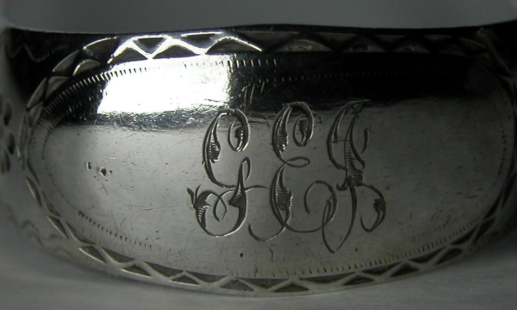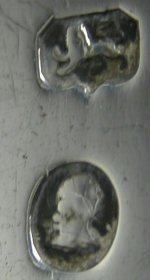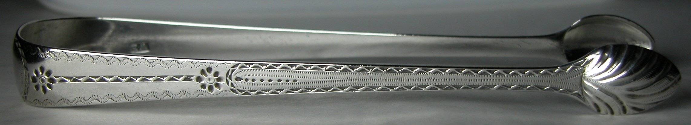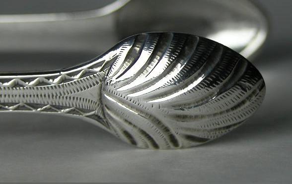 This pair of tongs is dated c1786 - 1790. The hallmark and maker's marks are now under the bow. This seems to be a feature of this maker which is quite unusual. The tongs are a lovely pair of bright cut tongs with the engraving still bright and clear. The monogram is of an unusual style, perhaps added later and the bowls are a deep cut engraved pattern. Click on any picture to enlarge |
