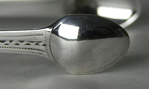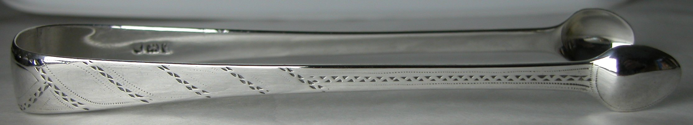This is a pair of standard style bright cut tongs with a nice diagonal pattern on the arms. They are dated 1791/92 which is the first year that date letters appeared on sugar tongs in London. Notice the maker's mark is very different to that of William Chatterton. The maker's mark is very indistinct but can still be detected as "WC". Click on any picture to enlarge |