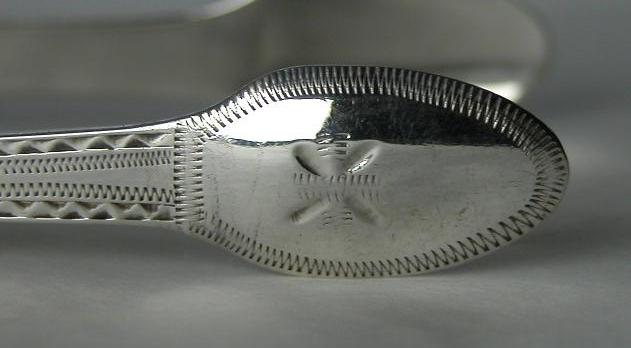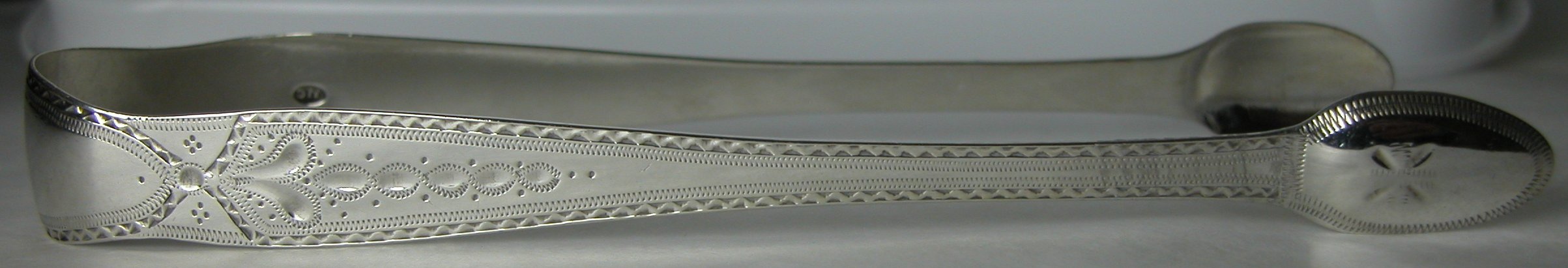 These tongs have a lovely intricate bright cut engraved pattern and are slightly flared towards the tops of the shoulders. They are dated 1790/91.