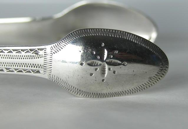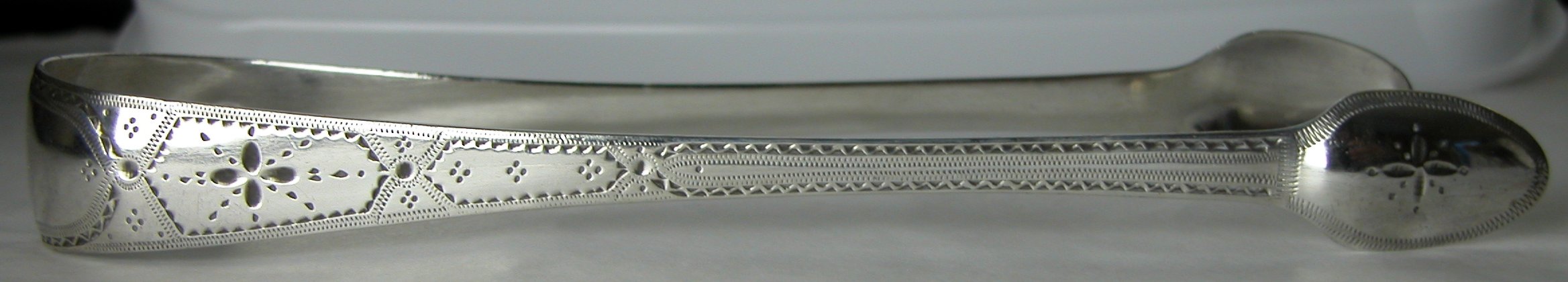 These tongs have a lovely intricate bright cut engraved pattern but this time have no flare to them. They are dated 1790/91.