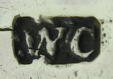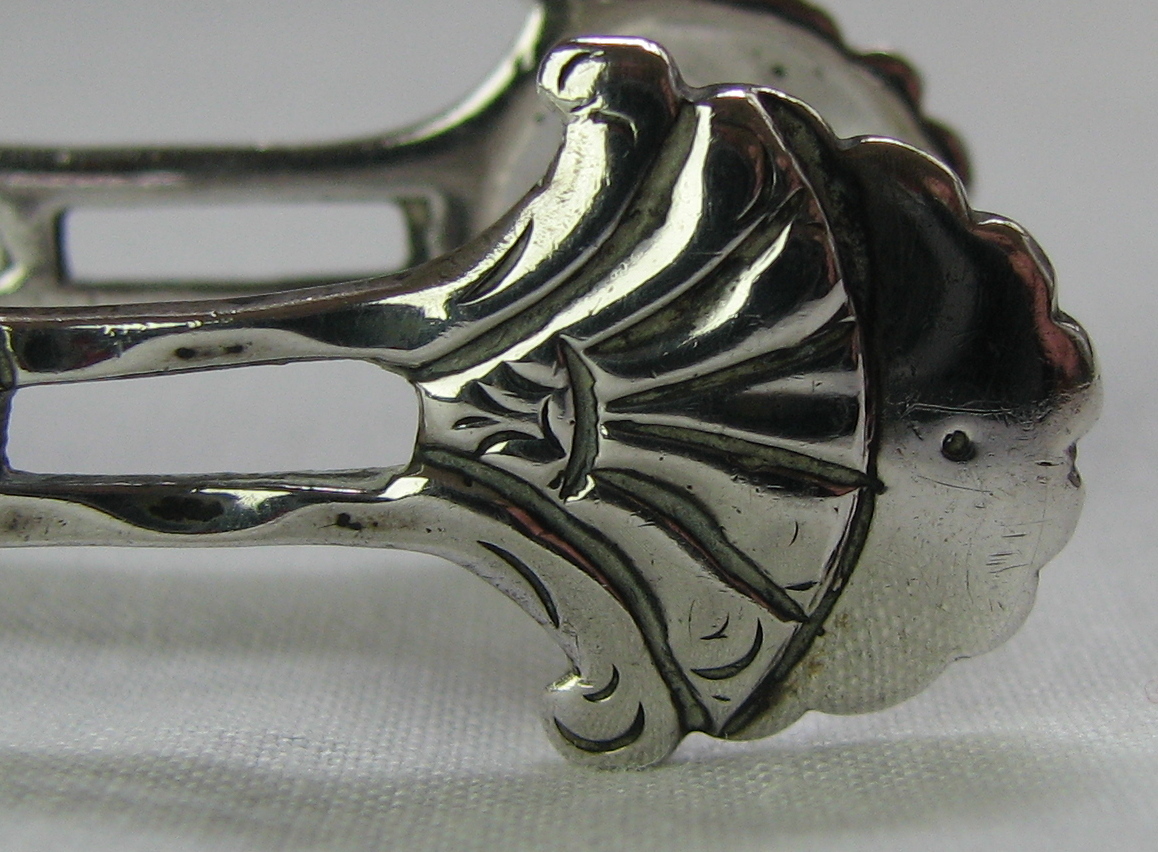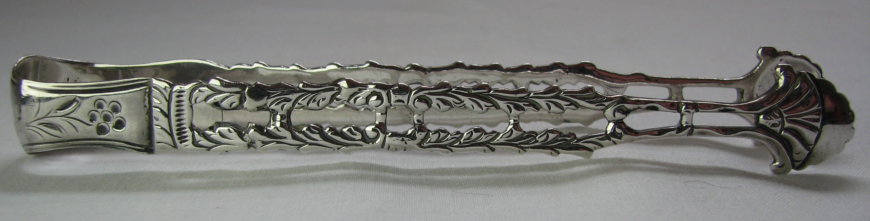 This is a pair of cast tongs. They have an interesting "half moon" style to the bowls and a bright cut engraved flower to the shoulders. They also have an interesting engraved star pattern to the bow. They are dated c1775 - 1780. Sadly, as if often the case with cast tongs, they suffer from a number of repairs. Click on any picture to enlarge |