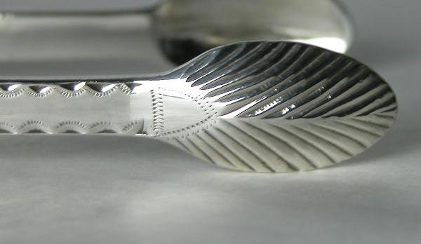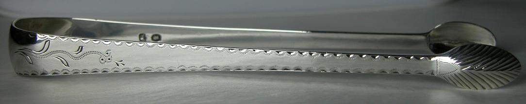 This particular pair of tongs is bright cut engraved with a trailing leaf and flower pattern to the top half of the arms and a series of half-moon shaped patterns down the sides of the arms. The bowls are deep cut engraved in a leaf pattern, which is quite common with tongs of this period. They are dated 1786 - 1790. Click on any picture to enlarge |