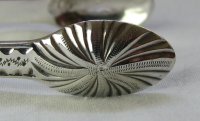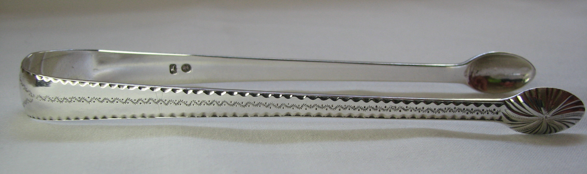 This particular pair of tongs is bright cut engraved with a delightful diamond shaped edge to the arms. The bowl has a lovely swirling pattern that is most unusual. These tongs are of quite a thick guage silver and are in superb condition with the bright cut engraving still being particularly sharp. They are dated 1786 - 1790. Click on any picture to enlarge |
