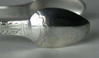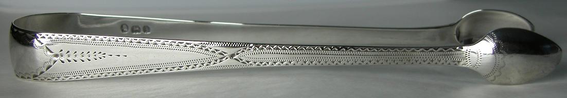 This particular pair of tongs is bright cut engraved with a fairly ordinary style about them although they do have an interesting curving line of pattern to the tops of the bowls. They are dated 1796/97.