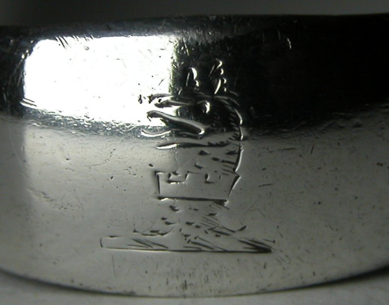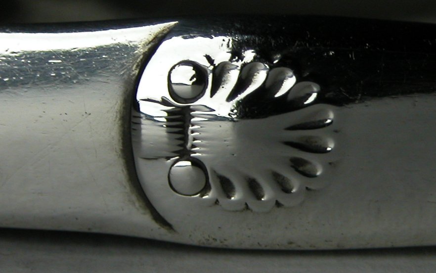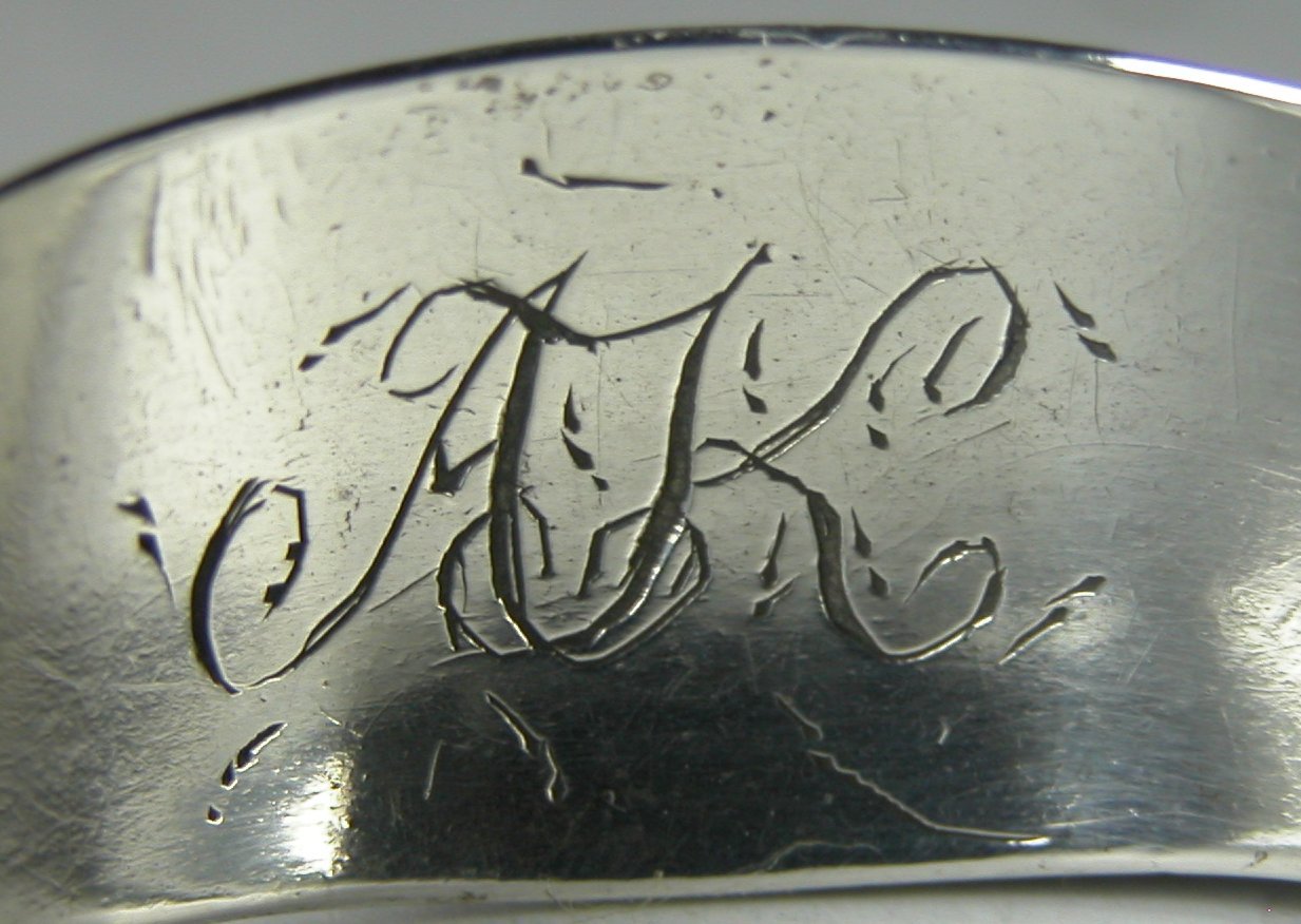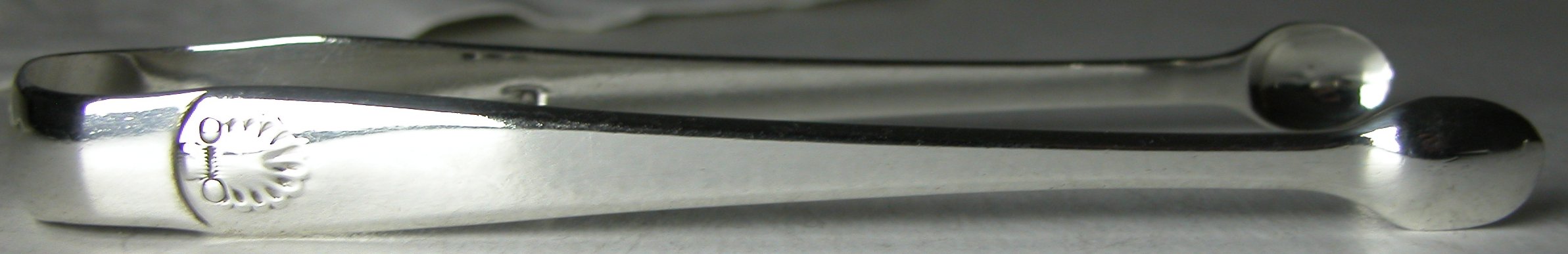 This particular pair of silver sugar tongs is unusual. They have the clipped duty mark, dating them between 7th July 1797 and 28th May 1798. They feature the shell motif near the top of the arms. This pattern was only very rarely used at this time, although the shell motif is much more prevalent from abut 10 - 15 years later. They are also marked with two monograms, the dragon, (if it is a dragon), with a crown around its neck is on the outside and the initials "AK" on the inside, underneath the bow. These tongs are in excellent condition and are nearly 6 inches long and weigh 49.5 grams.