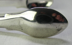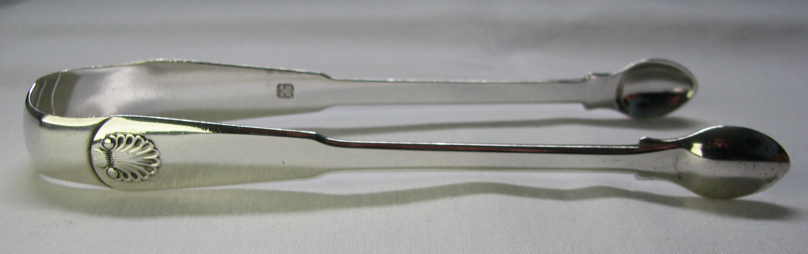 This particular pair of silver sugar tongs is unusual. They are properly fiddle and shell pattern although the tops of the arms are quite curvy compared with later fiddle pattern and there is a distinct inward flare to the bow. They feature the shell motif near the top of the arms. This pattern was only very rarely used at this time, although the shell motif is much more prevalent from abut 10 - 15 years later. These tongs are in excellent condition and are nearly 6 inches long and weigh 48.4 grams.