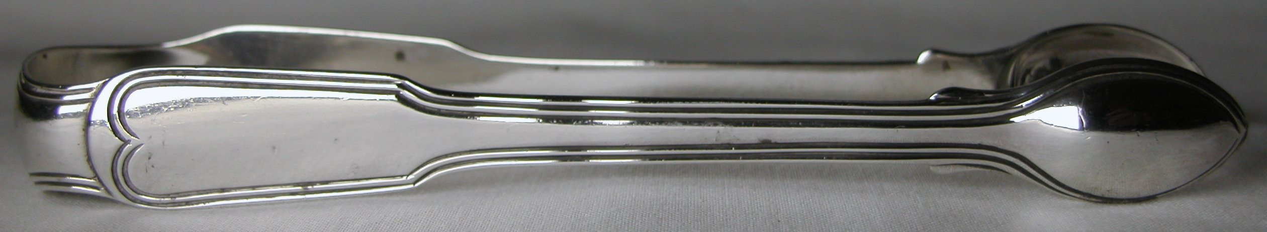 These are an interesting pair of tongs. They have a double thread edge and are fiddle pattern. The fiddle pattern is slightly different in that the top half of the arms is curved rather than the normal more angular style. The tops of the thread edge are curved into a nice inverted "V" shape. These tongs are dated 1806/07. They are in excellent condition although they do have some verdigris marks. They weigh 50.7 grams.
