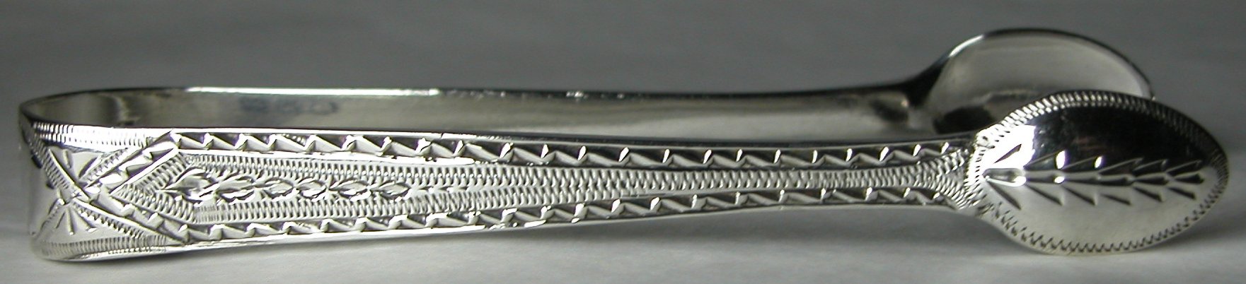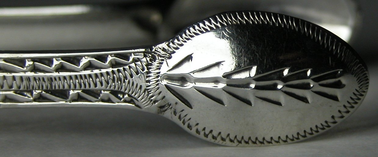 These tongs are just over 4 inches (105 cms) long. They are in almost pristine condition and show no signs of any repair although the bottoms of the arms do appear as if they may have solder where they join the bowls. If they have been shortened then I suspect this was done before they were engraved as the bright cut engraving seems to be consistent. They are dated 1816/17. Interestingly they are bright cut and most of Eley & Fearn's work of this time was plain, without bright cut engraving. They still weigh 38.3 grams which is more than most standard full size London tongs of this period.