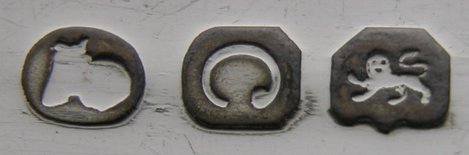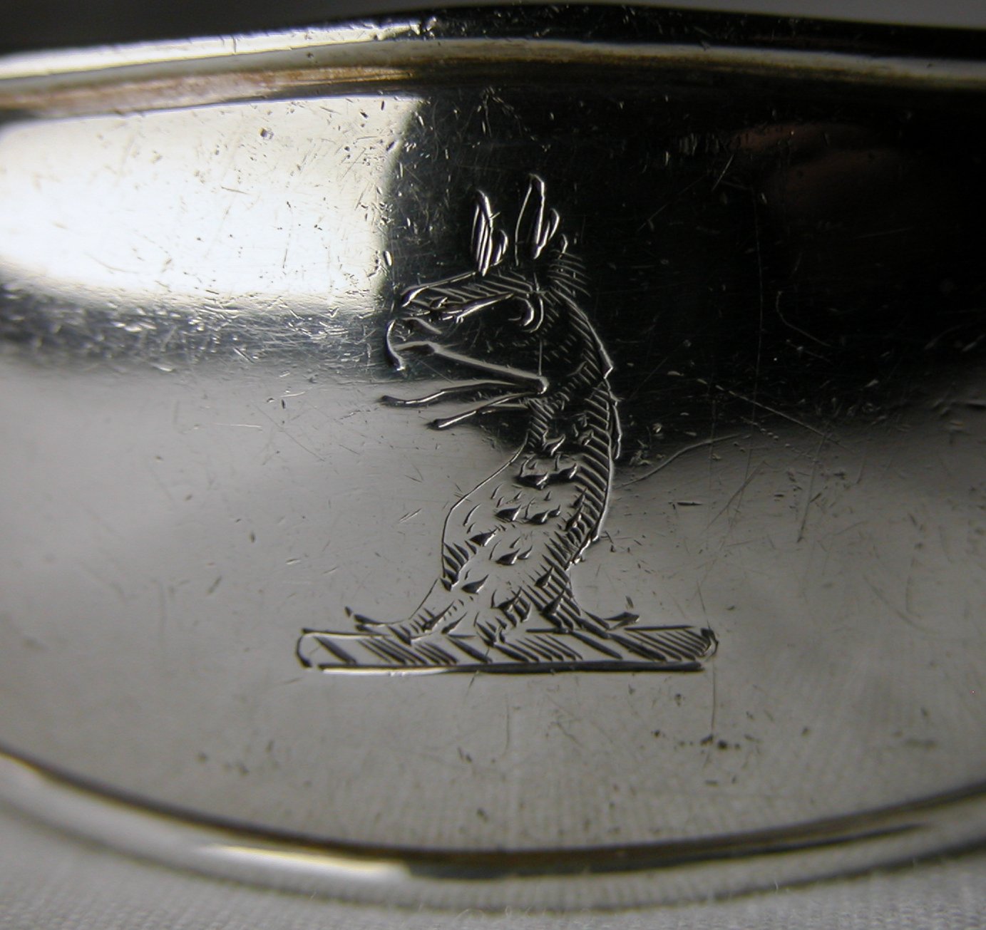 These tongs also have a thread edge but this time the thread edge runs all the way around the tongs, including around the bow. Again they have a characteristic fiddle pattern style, but this time there is no lip at the tops of the arms, just the lip immediately above the bowls. These tongs have a lovely "Dragon" crest - if it is a dragon! The tongs are in excellent condition and weigh 49.8 grams.
