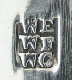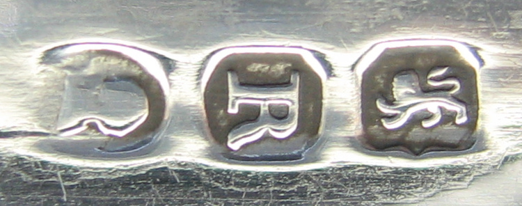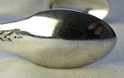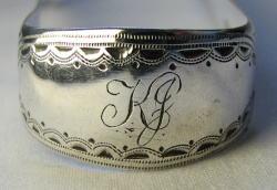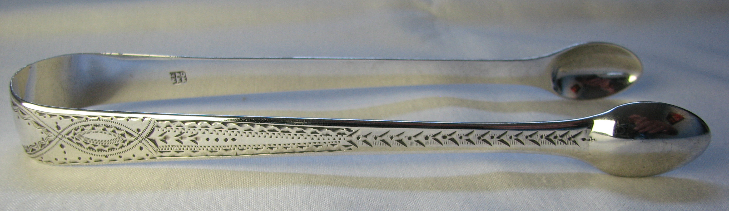 This is a pair of bright cut engraved tongs. The engraving is of a lovely elaborate style, finishing just above the tops of the bowls. These tongs do not have a squared and concave bow but they do have a bevelled edge to the arms. They are blessed with a monogram "KI". These tongs are dated 1812/13