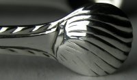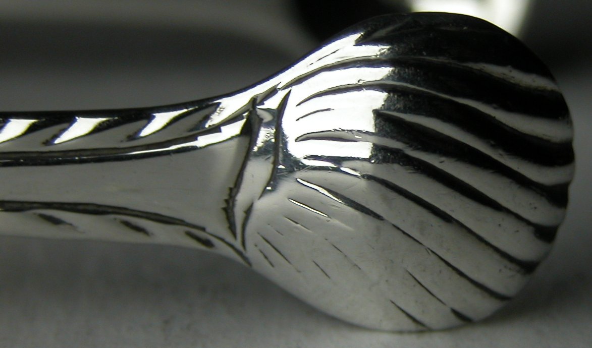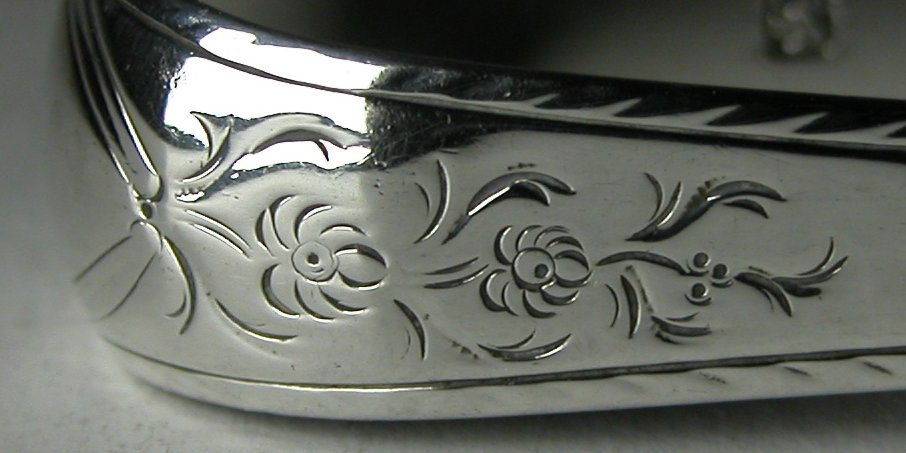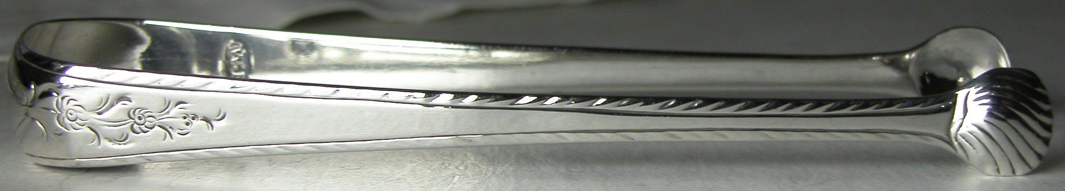 These tongs are a lovely early design, with feather edges to the arms and heavily engraved circular bowls. They have a lovely "Adam" style flower engraving to the tops of the arms. I have dated them at c1780.