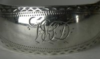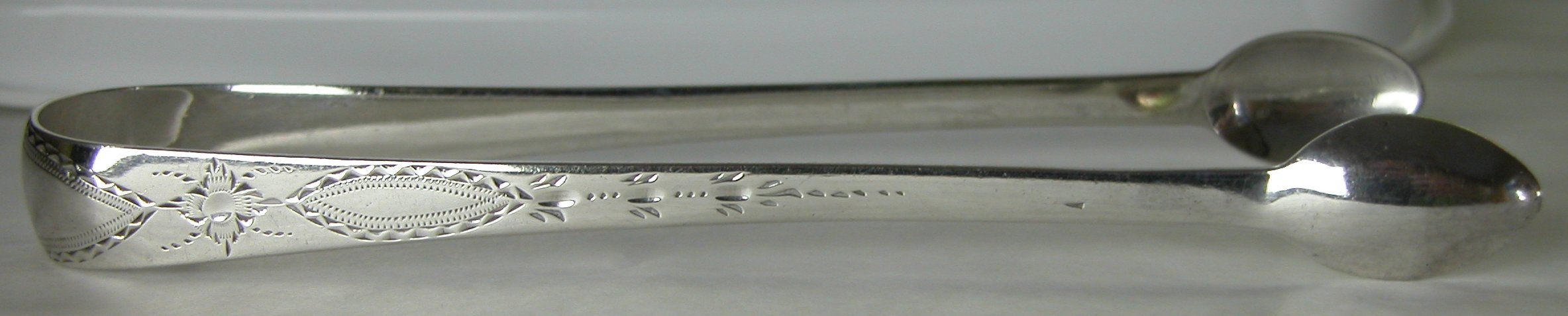 This is a fairly standard style pair of bright cut tongs with a nice engraved monogram. They are a little unusual in that they are only engraved to half way down the arms and have plain bowls. Generally this style did not start to become fashionable until at least 10 years later. They are dated 1795/96. Click on any picture to enlarge |