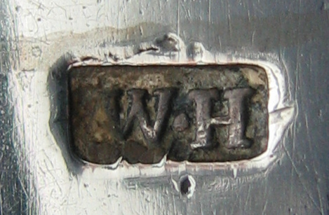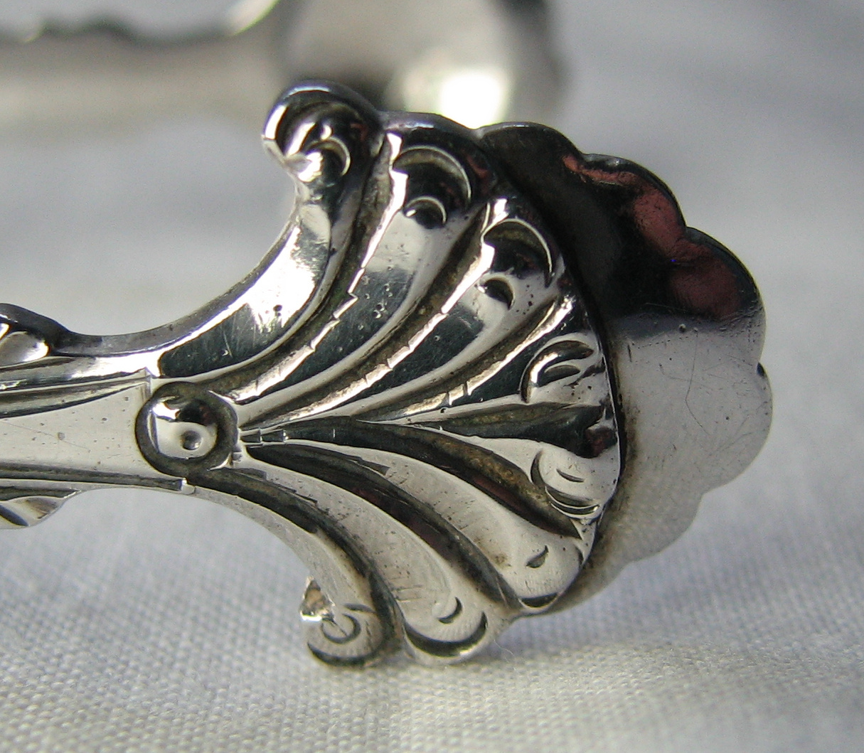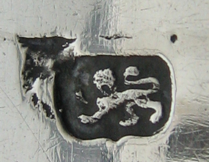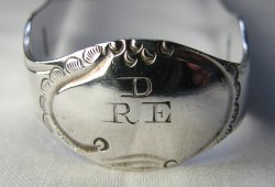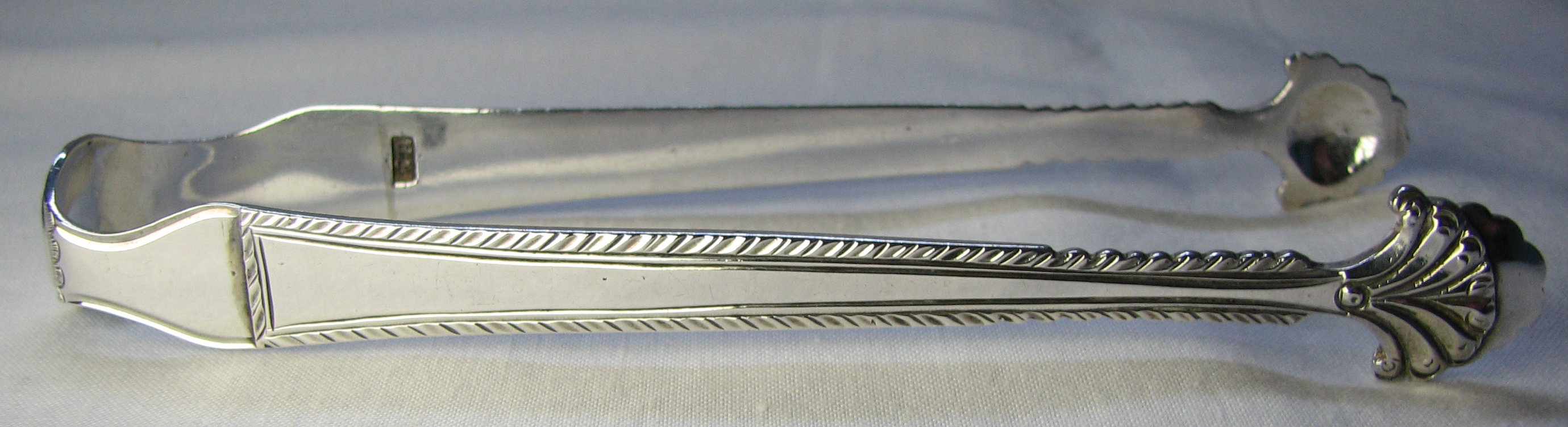 These are a pair of cast tongs. The two arms have been soldered onto the bow. They have scalloped half moon shell bowls and a betrothal or marriage monogram in a lovely cartouche with scrolls around it. The maker's mark is struck on the joint between the arms and the bow as is normal for these style tongs. The hallmark is similarly struck but they appear to have had two attempts at it. I have dated these tongs at c1765 but they may be a little later. Click on any picture to enlarge |