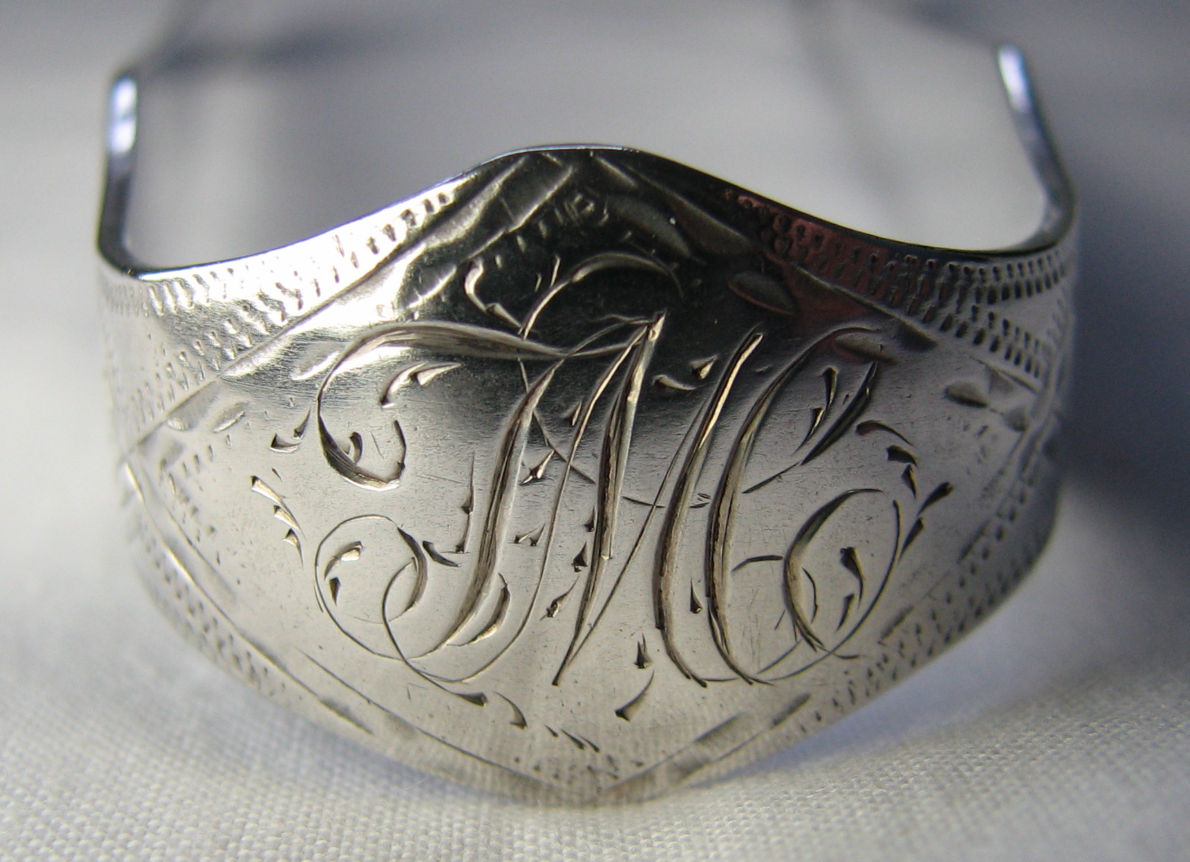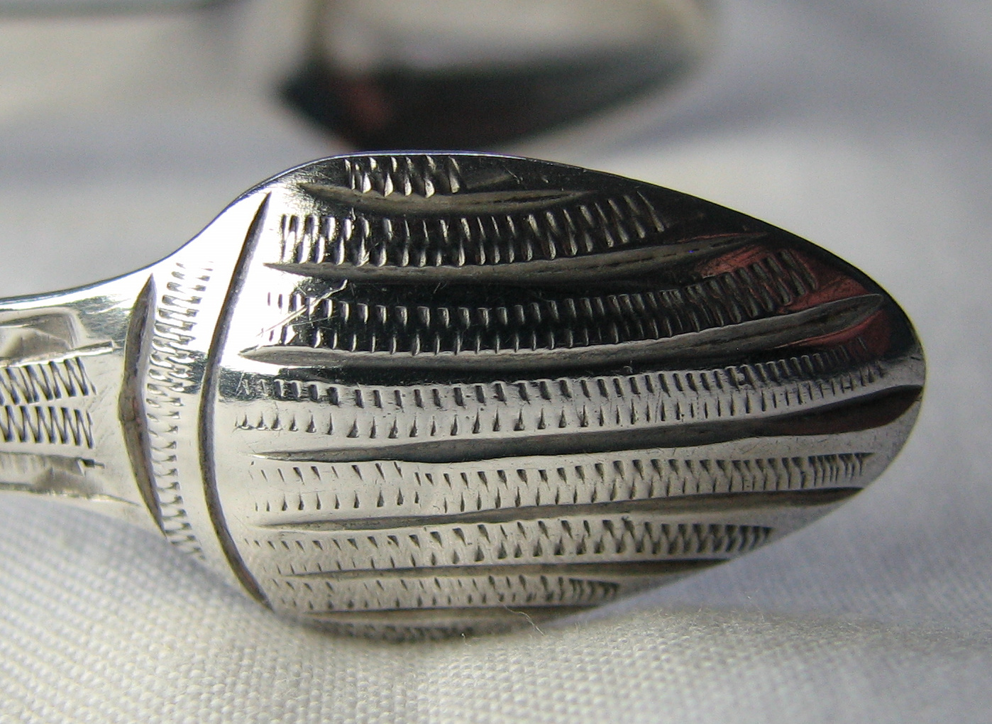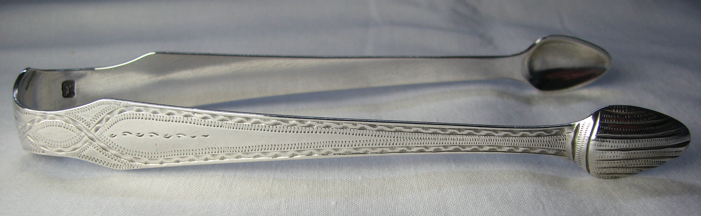 These are a pair of bright cut engraved tongs with a cut in shaped bow. They have pointed bowls with heavily engraved straight lines. They have an elaborate monogram to the bow. I have dated them at c1780.