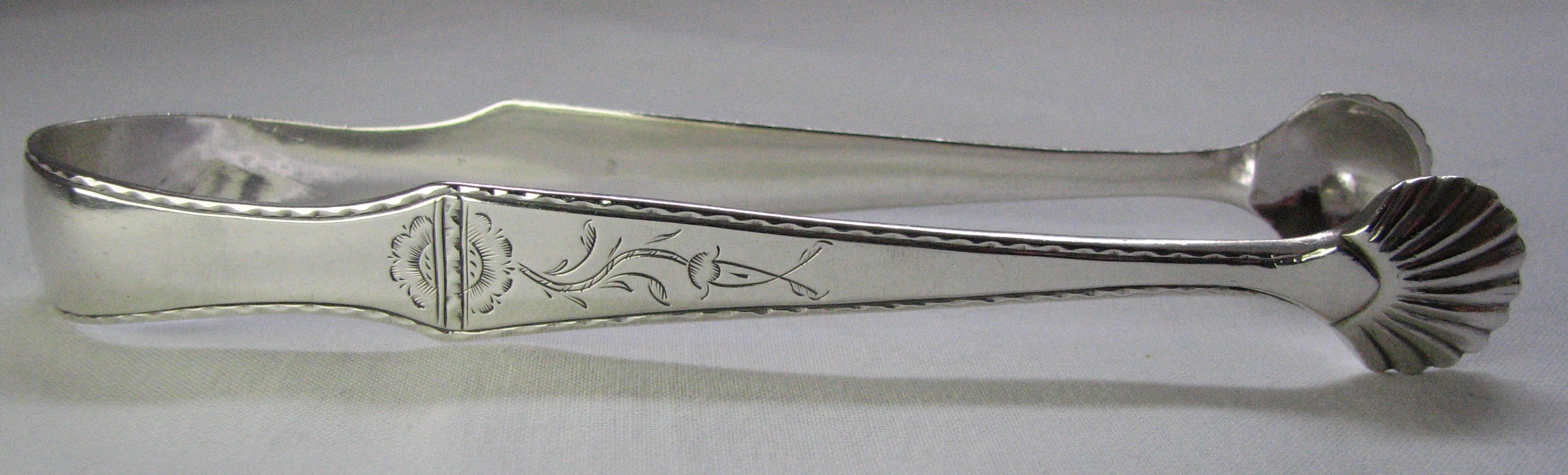 William Maddocks registered an incuse mark, undated, some time between 1733 and 1735. He then registered another mark as a small-worker on 16th February 1765. He appears in the parliamentary report list of 1773 as a watchcase-maker. The only other registered mark of the period of these tongs is that of William Moody, a large-worker, who registered a mark in August 1756. He too appears in the parliamentary report of 1773, as a small-worker. This means that purely from date alone, these tongs could be by either maker. From a close inspection of the mark itself, it definitely looks more like that of William Maddocks but as is so often the case, we cannot be certain. These tongs are cast, in 3 parts, with a shell bowl and are marked with the makers mark only. They are dated at c1780.