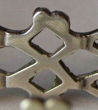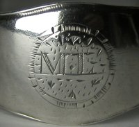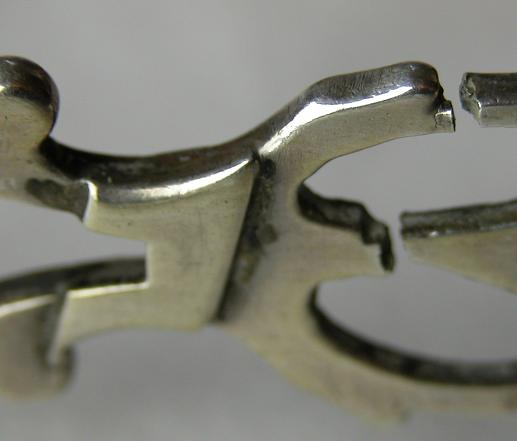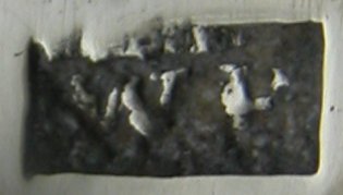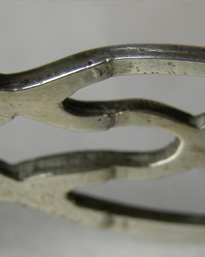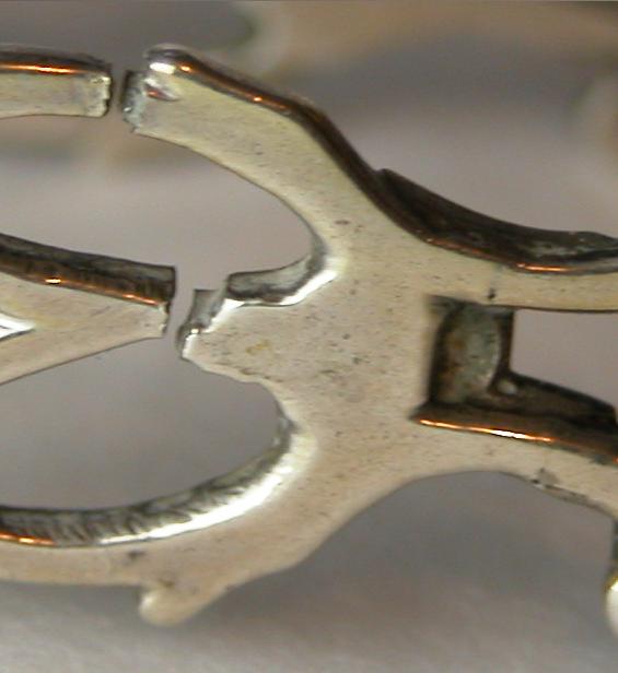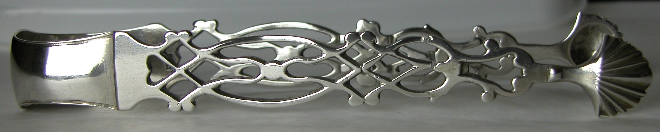I have attributed these cast sugar tongs to William Pinder, although this is by no means certain as the maker's mark is very difficult to identify. William Pinder entered his first mark on 30th May 1771, as a buckle-maker. I have decided that these must be the most loved pair of tongs that I have seen. Someone must have loved them very much to have had them repaired so often! They are a mess. Even the Lion Passant is not distinguishable, although this may very well be an attempt at avoiding paying hallmarking fees & not be a genuine hallmark at all. This pair of tongs is probably the worst example I have seen for number and quality of repairs. Click on any picture to enlarge |