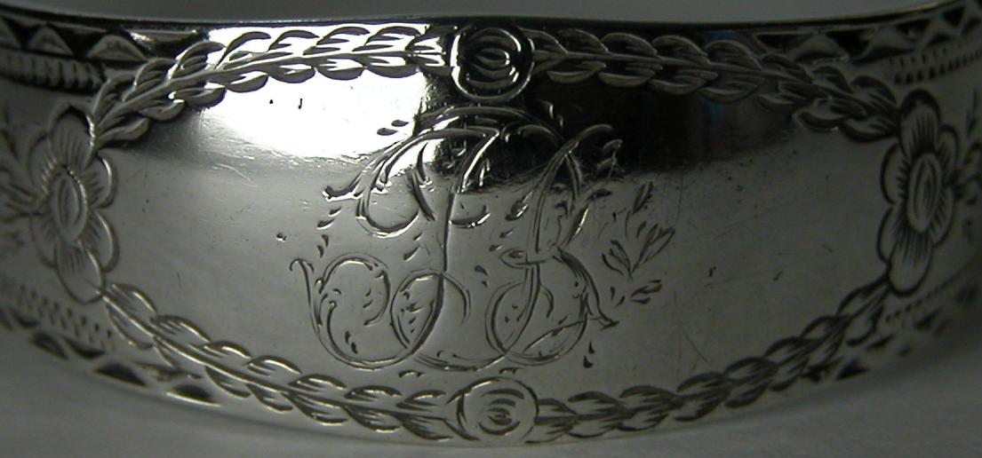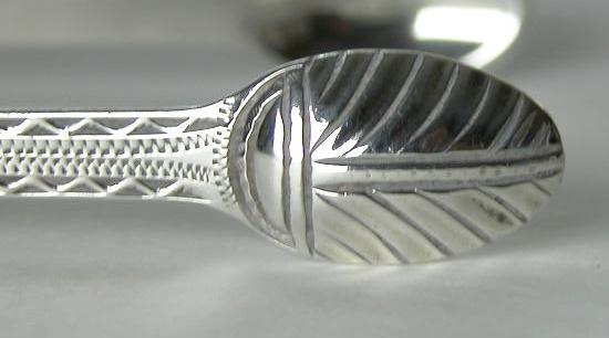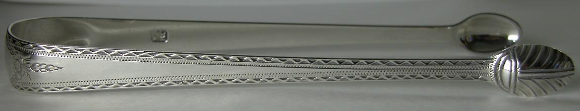 This is a pair of bright cut tongs, with a deep cut engraved leaf pattern in the bowls. The tongs are marked in the bowls & dated c1780.