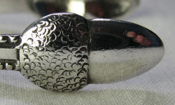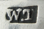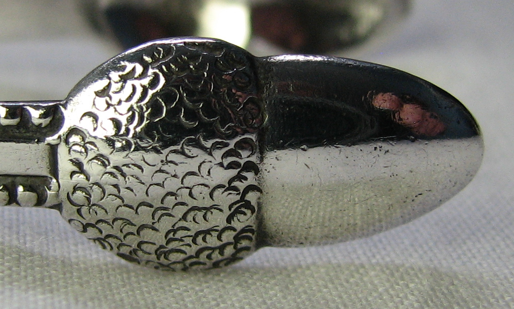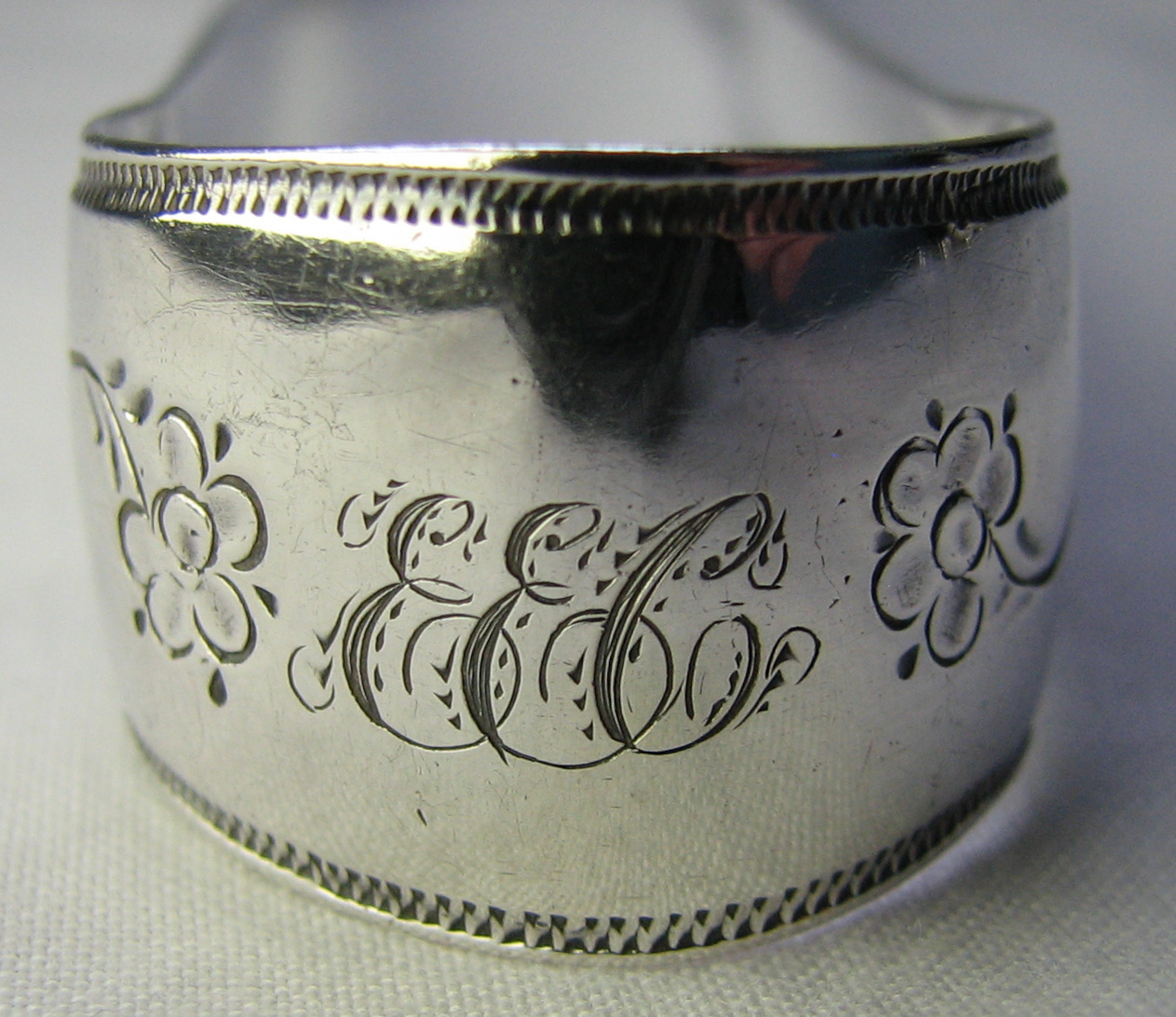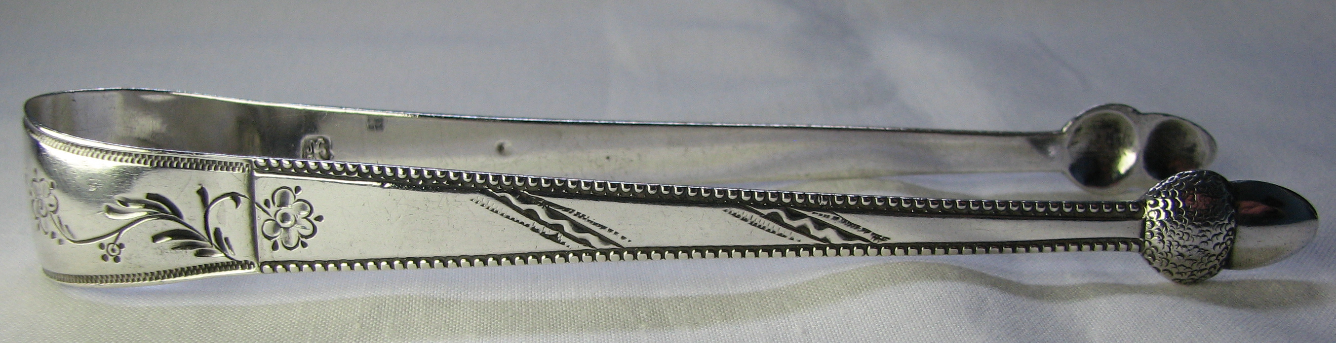 These tongs are a beautiful example of early tongs made in three parts. The arms can very clearly been seen as having been made separately to the bow. They have a beaded pattern around the edges of the arms and deep acorn bowls. They also sport a lovely engraved monogram, flanked by two flowers. I would date these at between 1773 and 1775. Click on any picture to enlarge |