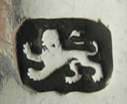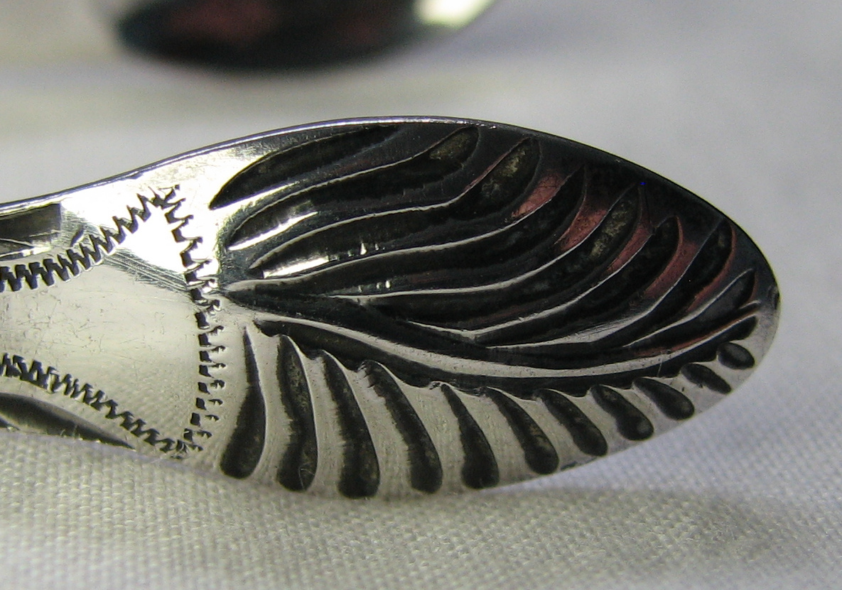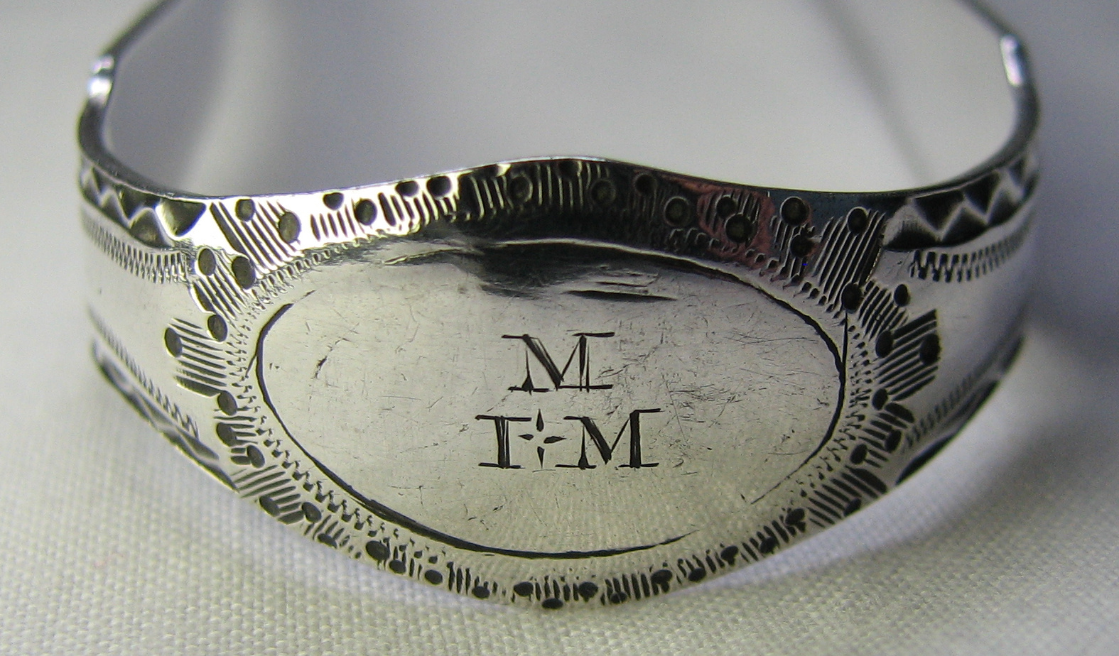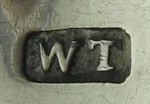 These tongs are a pair of flared, bright cut tongs. They have an engraved pattern all around the edges of the arms and deep cut engraved bowls. They have a betrothal or marriage monogram. One can just about see a pellet between the W and T of the maker's mark. They are probably dated between 1780 and 1784. Click on any picture to enlarge |