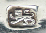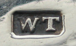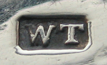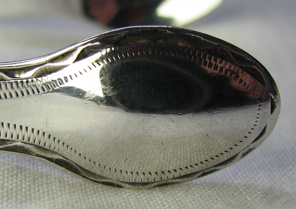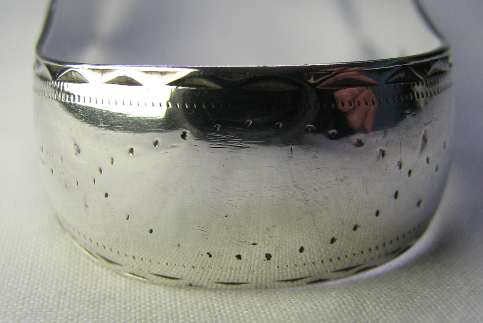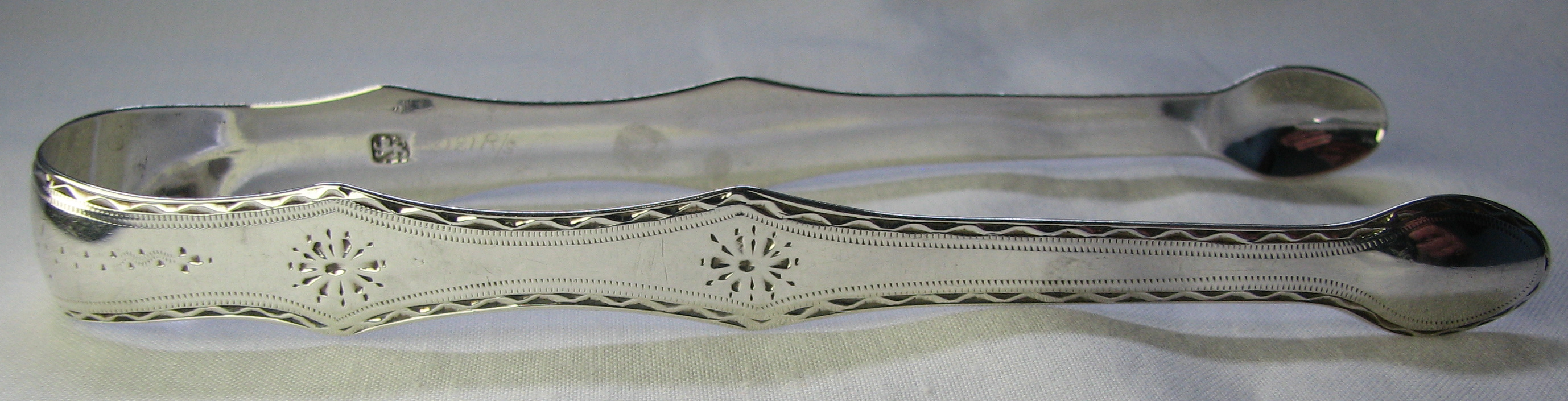 These tongs are a pair of double flared, bright cut tongs. They have a faint prick dot pattern on the bow forming a cartouche for a monogram. Notice that there is no pellet with this makers mark. They are probably dated between 1780 and 1784. Click on any picture to enlarge |