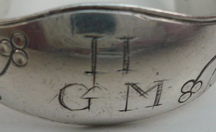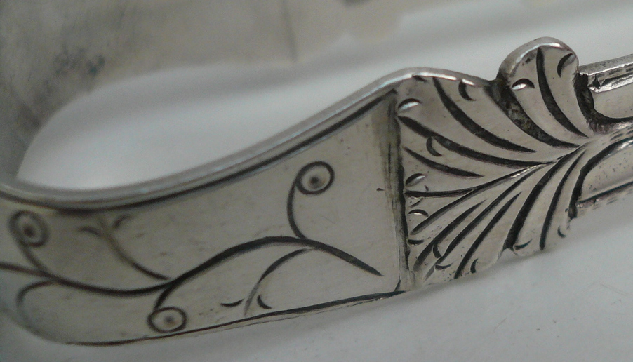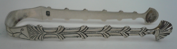 The firm of Hampston & Prince was first established in 1770. They worked together until 1799. There are several marks registered for this partnership. They were joined by George & Robert Cattle early in 1796 but a new maker's mark was not immediately introduced. This particular pair of tongs are cast, which is a rarity in itself. The tongs are dated prior to 1784, probably c1780. Click here to see tongs by Hampston, Prince & Cattles. The pictures are courtesy of Dart Silver Ltd. Please click on the picture to visit their web-site. Click on any picture to enlarge |